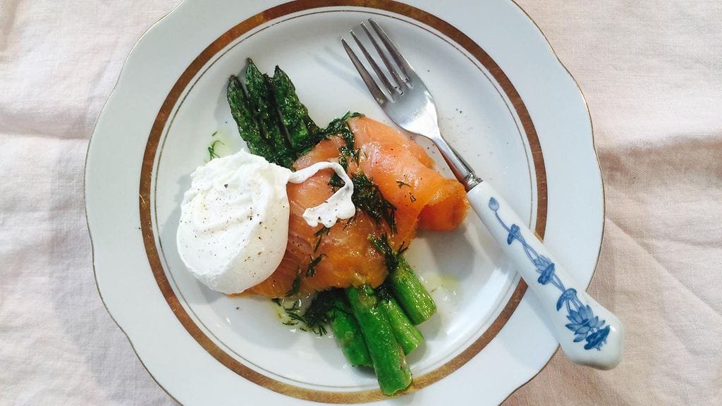 Leikkaa parsojen tyvestä noin 2 cm vaalea puiseva pala pois. Huuhtele ja kuivaa parsat. Kuumenna oliiviöljy ja voi paistinpannulla ja paista parsoja 3-4 minuuttia. Mausta suolalla ja mustapippurilla. Mausta voisula limetin kuoriraasteella ja mehulla sekä hienonnetulla tillillä. Jaa parsat lautasille ja asettele niiden päälle kylmäsavulohiviipaleet. Valuta päälle maustettua voisulaa ja nosta lopuksi lautasille uppomunat. Tarjoile heti.