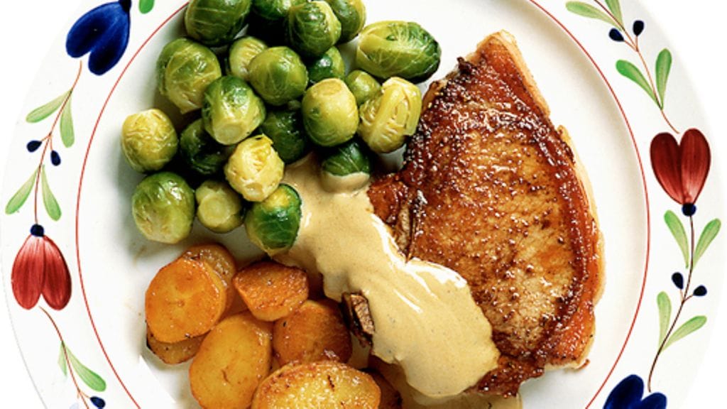 3. Nosta kyljykset pannusta. Kaada liemi kastikekattilaan ja anna kiehua 1 minuutti. Lisää ranskankerma ja ranskalainen sinappi, vatkaa ja keitä kokoon kastikkeeksi. Mausta suolalla ja vastajauhetulla valkopippurilla. Tarjoile kyljykset sinappikastikkeen, perunoiden ja ruusukaalin kera.