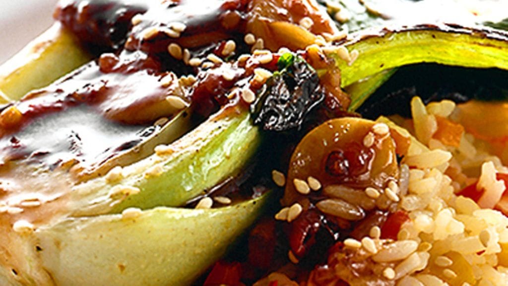 3. Kuumenna uuni 275 asteeseen. Laita pak choi voideltuun, uuninkestävään vuokaan. Lusikoi päälle seesamikastiketta ja paista uunissa 10-15 minuuttia. Tarjoile vihannesriisin kera.