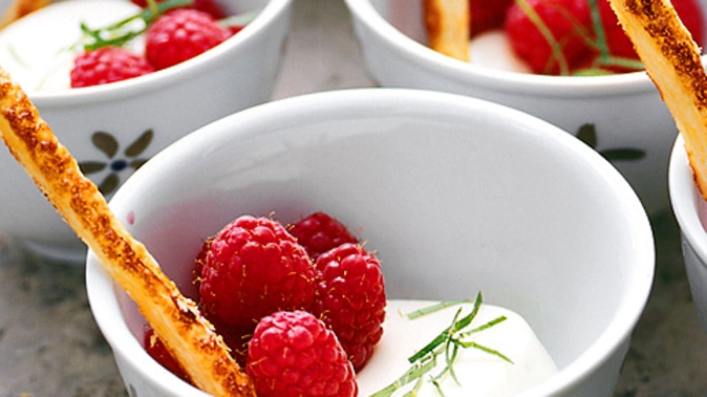 3. Kaada seos annosmaljoihin ja anna jähmettyä jääkaapissa 2-3 tuntia ennen tarjoilua. Koristele vadelmilla ja pienillä kekseillä.