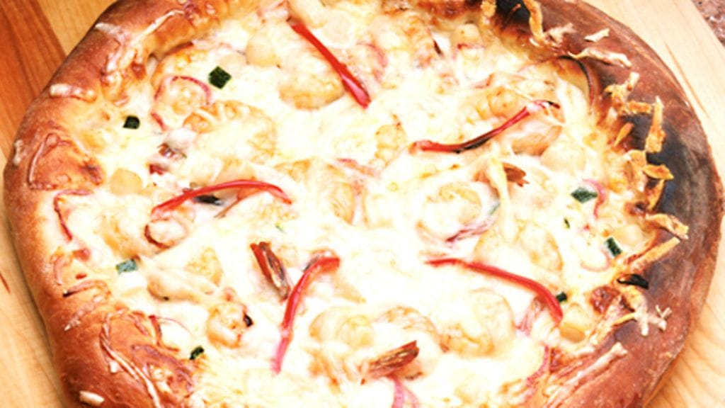 4. Alenna lämpöä keskilämmölle tai hieman alle. Levitä pohjalle tomaattipyreetä, melkein reunaan asti, ja asettele päälle katkarapuja ja paprikasuikaleita. Ripottele päälle juusto ja laita kansi päälle. Paista kunnes juusto alkaa sulaa ja pohja on kauniin värinen, n. 4 minuuttia. Tarjoile heti.