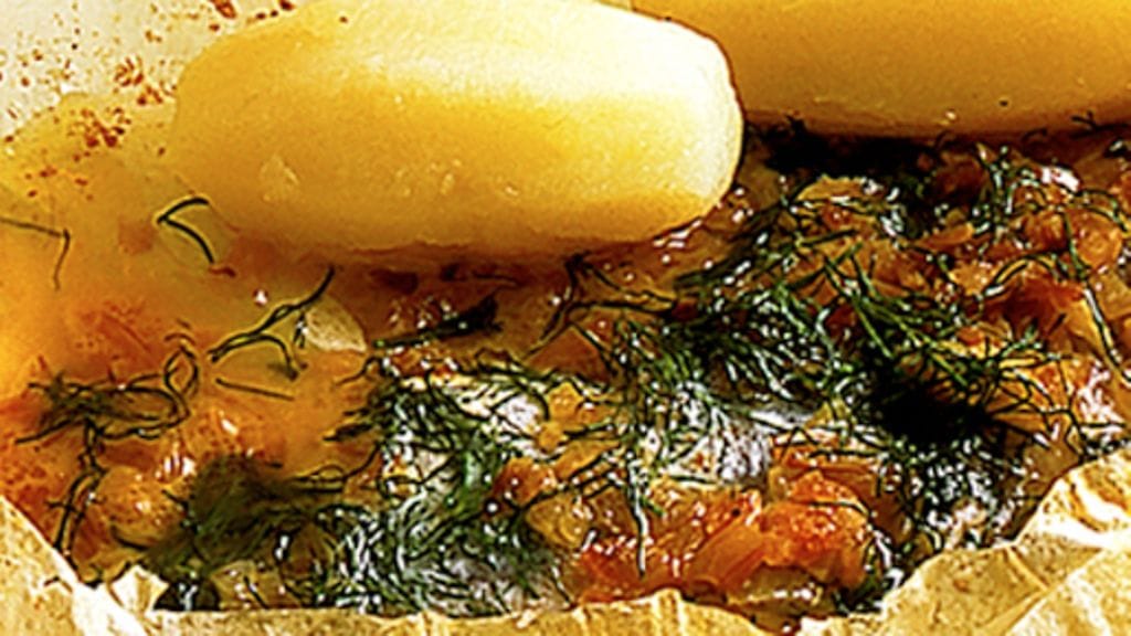 1. Kuori ja hienonna sipuli. Kuullota sitä kahdessa ruokalusikallisessa voita alhaisella lämmöllä, kunnes se on pehmeää ja kullanruskeaa. Silppua tilli. Taita voipaperiarkit kaksinkerroin ja voitele keskikohta lopulla voilla. Aseta yksi filee jokaiselle voipaperille. Levitä sillin päälle sipulia ja tilliä.
