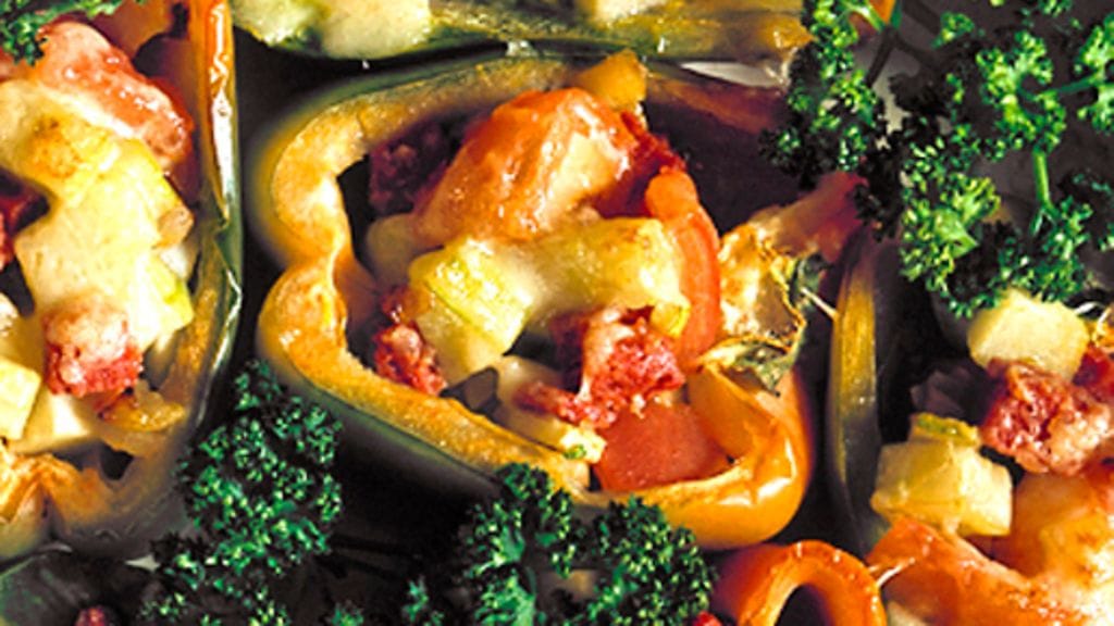 1. Kuumenna uuni 225 asteeseen. Halkaise paprikat, poista siemenet. Esikeitä ne kevyesti suolatussa vedessä 5 minuuttia, laita uunivuokaan ja uuniin 10 minuutiksi.