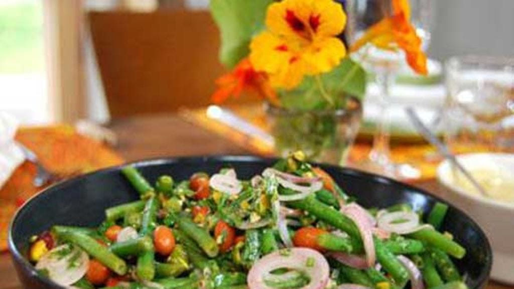 Poista neulapapujen päät ja ryöppää perattuja papuja viisi minuuttia suolatussa vedessä. Jäähdytä kylmässä vedessä. Valuta ruskeista pavuista säilykeliemi ja huuhtele ne. Pilko salottisipulit renkaiksi. Tee vinegretti yhdistämällä kaikki kastikeaineet. Sekoita vihannekset ja vinegretti huolellisesti isossa salaattikulhossa. Tarkista maku.