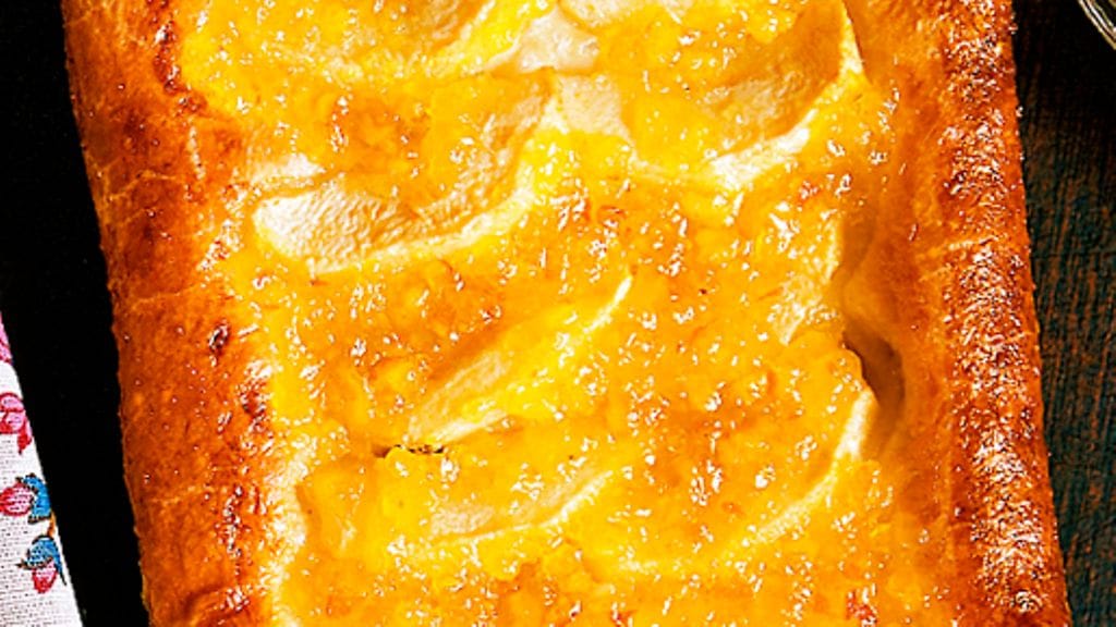 3. Kuumenna uuni 225 asteeseen. Laita pitko pellille. Penslaa pitkon taikinareuna munalla ja levitä omenoille marmeladia. Paista n. 20 minuuttia.