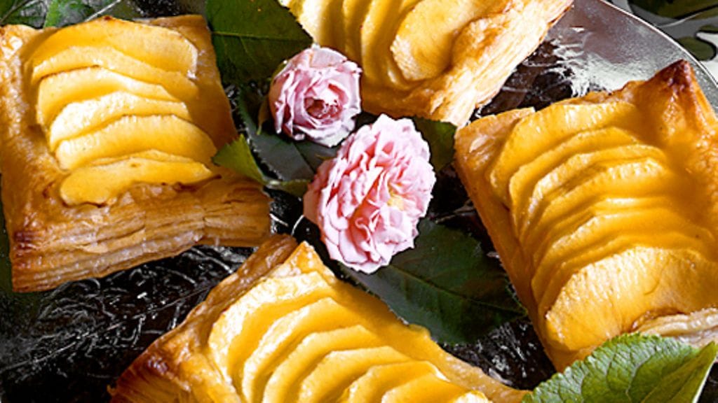 3. Paista 15-20 minuuttia uunin keskitasolla kunnes taikina on kauniin väristä ja omenat tuntuvat pehmeiltä. Levitä marmeladi heti päälle kun palat tulevat uunista.