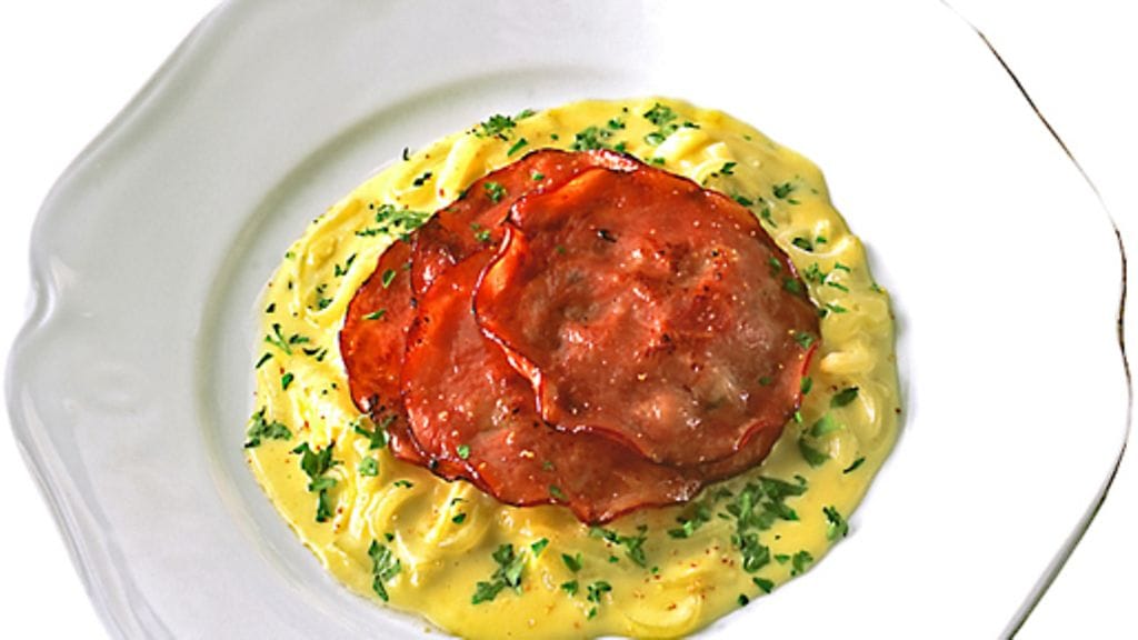 3. Pariloi kinkku niin, että se saa hieman väriä ja muuttuu rapeaksi. Jaa sipulimuhennos lämpimille lautasille ja nosta päälle kinkkusiivu. Ripottele pinnalle hienonnettua persiljaa.