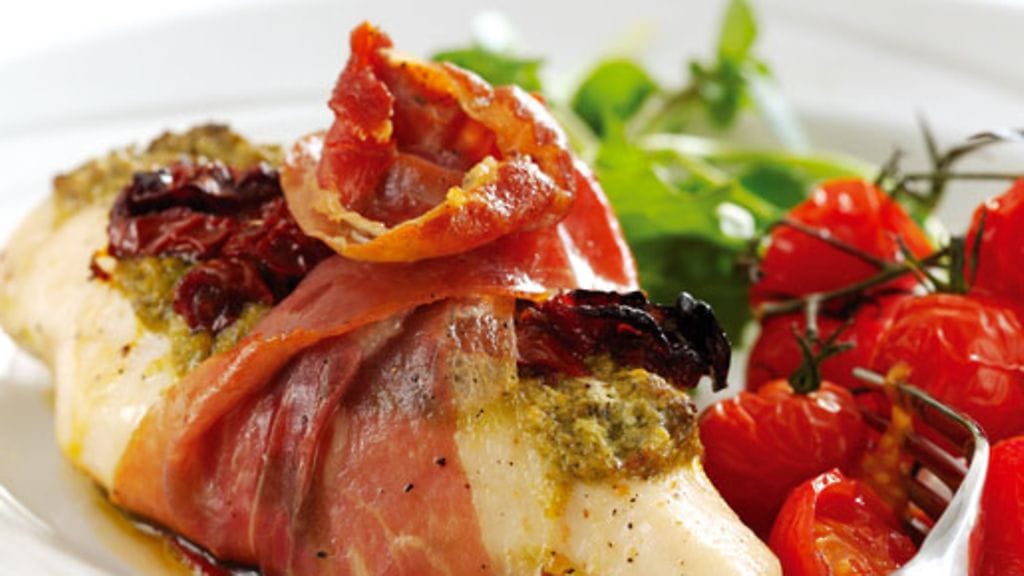 Valuta ja pilko aurinkokuivatut tomaatit. Täytä taskut pestokastikkeella sekä aurinkokuivatuilla tomaateilla. Kiedo kaksi siivua parmankinkkua jokaisen kanafileen ympärille.