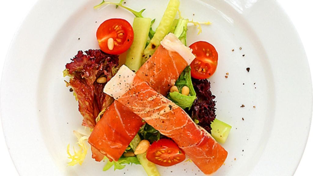 2. Suikaloi paprika. Asettele paprika, salaatti ja parmankinkku hienosti lautaselle, koristele parmesaanilastuilla ja viimeistele kastikkeella. Ripottele päälle pinjansiemeniä ennen tarjoilua.