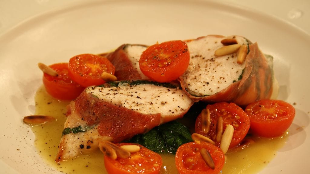 Leikkaa broilerin fileet sivuttain puoliksi, jos fileet ovat isoja. Mausta ne suolalla (kevyesti, sillä suolaa on myös juustossa ja kinkussa) ja pippurilla. Levitä fileiden päälle basilikasilppua ja tuoretta parmesaaniraastetta. Pyöräytä kunkin fileen ympäri tiukasti kaksi parmankinkkusiivua.