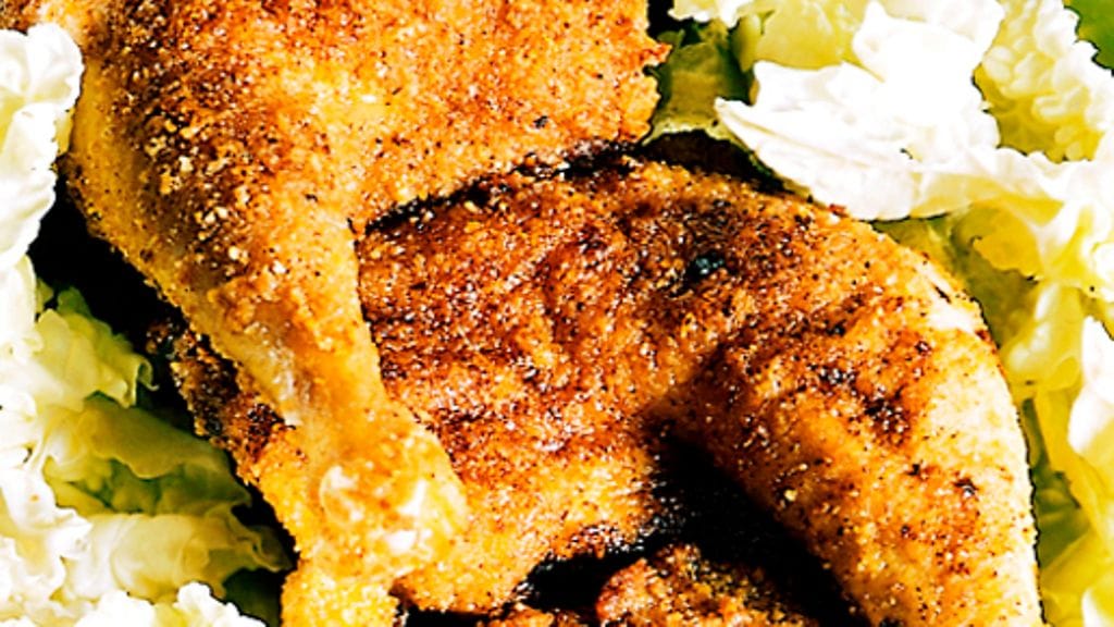 2. Kääntele ne vispatussa munassa ja sen jälkeen parmesaani-korppujauhoseoksessa. Nosta paneroidut reidet uunivuokaan. Tiputtele pinnalle hieman oliiviöljyä.