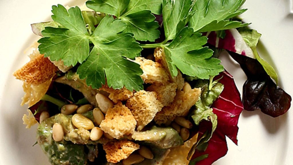 2. Hienonna sardellit ja muussaa ne haarukan avulla. Lisää 2 rkl oliiviöljyä ja puristettu valkosipulinkynsi. Levitä seos leipäviipaleille ja paista uunissa n. 20 minuuttia kunnes leivät ovat rapeita. Leikkaa leivät 2 cm kokoisiksi kuutioiksi ja anna jäähtyä.