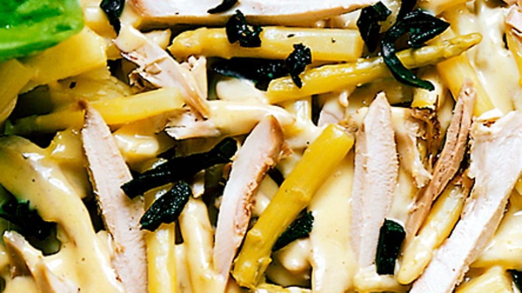 2. Viipaloi perunat. Sekoita ne broilerisuikaleiden ja parsan kanssa kulhossa.