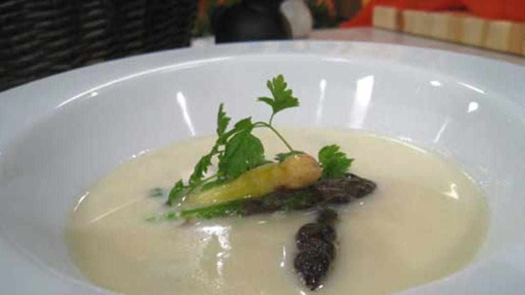 Anna kiehua kymmenen minuuttia, jotta jauhot kypsyvät. Mausta keitto suolalla ja valkopippurilla ja lisää loput parsat sinne. Koristele keitto kirvelillä ja tarjoa lisäksi tuoretta leipää.