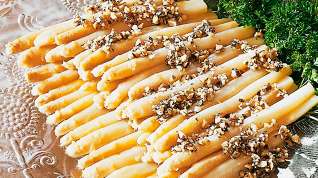 3. Sulata voi. Kaada voi parsojen päälle ja ripottele päälle pähkinärouhe. Tarjoile heti.