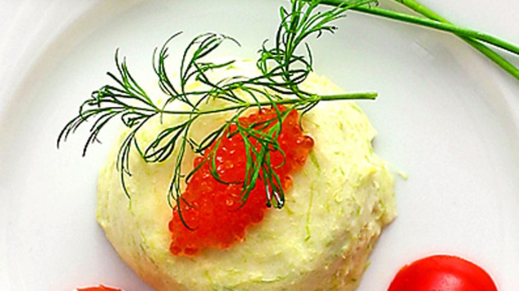3. Päivä 2: Kumoa bavaroiset lautasille. Koristele kirjolohenmädillä, tomaateilla, tillillä ja ruohosipulilla.