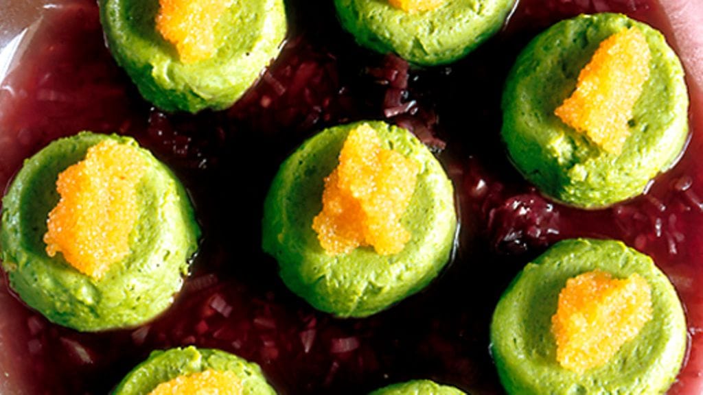 3. Irrota timbaalit reunoilta terävällä veitsellä ja kumoa vuoista tarjoiluvadille. Kaada kastike niiden ympärille ja koristele timbaalit mädillä.