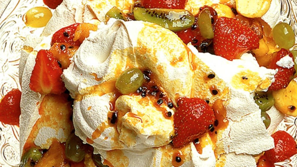 3. Vatkaa kerma kuohkeaksi vaahdoksi. Laita marenkilevy pohjimmaiseksi ja kerrostele sen jälkeen hedelmäseosta ja kermavaahtoa, nosta toinen marenkilevy päälle ja kerrostele loput hedelmät ja kermavaahto. Tarjoile heti, etteivät marengit ehdi pehmetä liikaa.