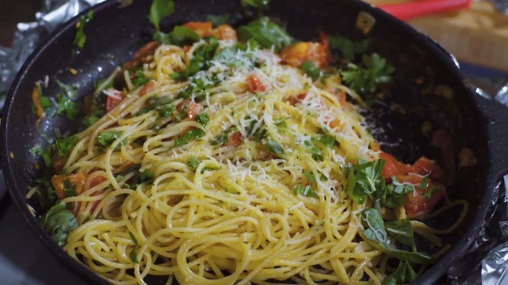 - Kuumenna pannulla oliiviöljyä, lisää valkosipuli ja tomaattikuutiot. Paista kevyesti muutama minuutti ja lisää pannulle valutetut spagetit ja basilika.
