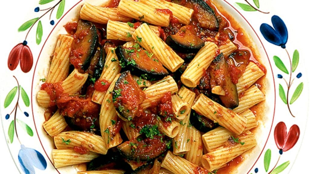 1. Leikkaa munakoiso 1 cm:n viipaleiksi. Ripottele viipaleiden pintaan suolaa, pane lautanen päälle painoksi ja anna vetäytyä tunnin ajan. Valuta viipaleet. Keitä pasta pakkauksen ohjeen mukaan. Kaada lävikköön. Kuumenna uuni 200 asteeseen.