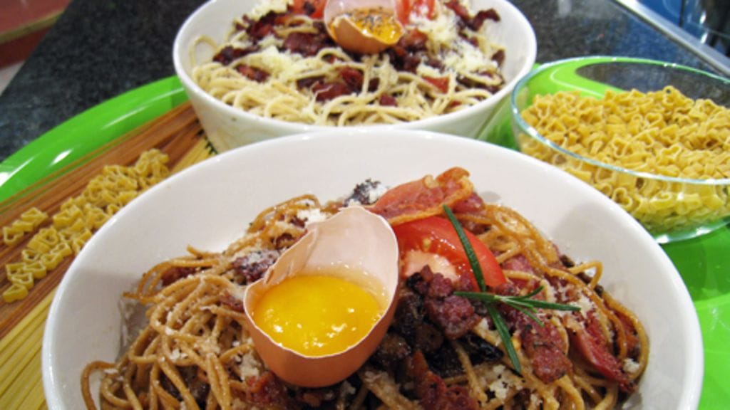 3. Vatkaa munat ja maito. Ota pata liedeltä ja lisää munakerma, sekoita. Lisää parmesaania maun mukaan ja tarjoile heti.