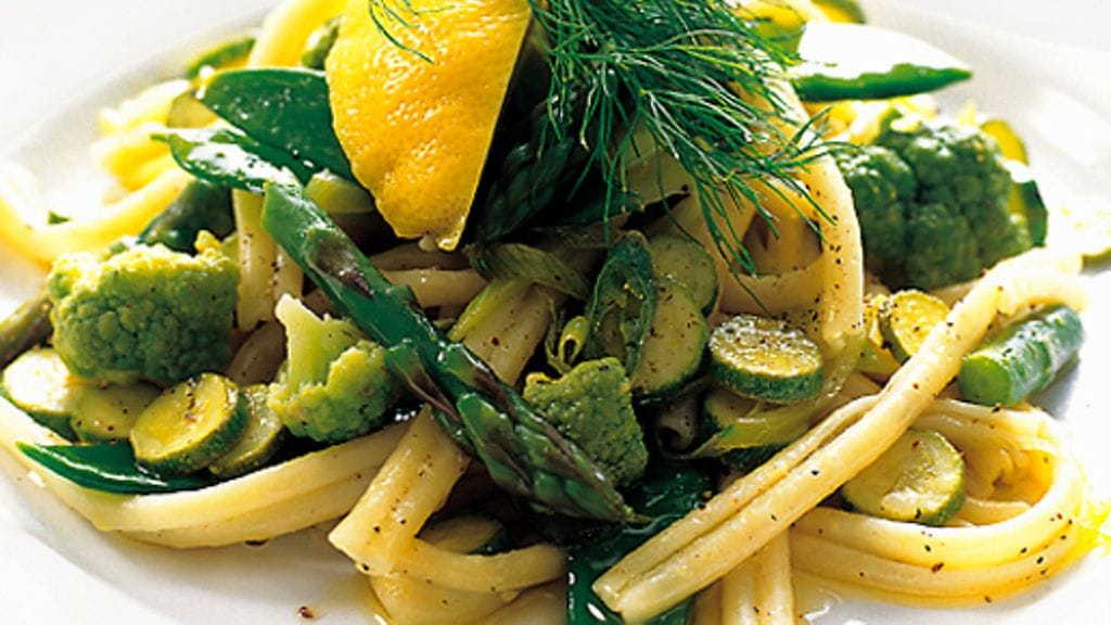 3. Sekoita vastakeitetyn pastan joukkoon loput oliiviöljystä, mausta suolalla ja pippurilla. Nosta purjo-sokeriherneseos pastan päälle.