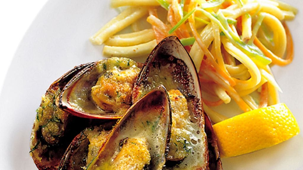 2. Valkosipulisimpukat: Kuori valkosipulinkynnet. Sekoita voi ja korppujauho keskenään ja purista valkosipulinkynnet joukkoon. Levitä seos simpukoiden päälle ja gratinoi uunissa noin 8 minuuttia.