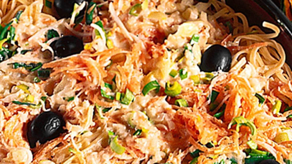 1. Raasta kaikki juurekset ja viipaloi purjo. Keitä pasta. Paista pekoni kevyesti ja valuta. Sekoita kaikki uunivuoassa, kääntele mukaan oliivit.