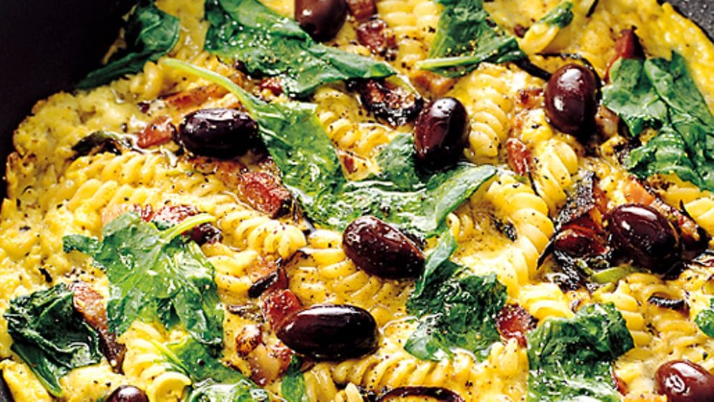 3. Vatkaa munat ja maito, mausta suolalla ja pippurilla. Siirrä pekonit, purjosuikaleet ja pasta paistinpannulle ja kaada päälle munamaito. Lisää pinaatti, oliivit ja fetajuusto ja paista miedolla lämmöllä puuhaarukalla sekoittaen. Valmis munakas on väriltään kullanruskea.