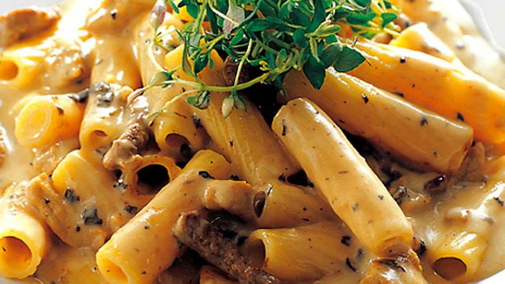 3. Kuutioi liha ja ruskista nopeasti paistinpannussa 2 ruokalusikallisessa voita. Siivilöi sipuli ja mausteet kastikkeesta ja lisää siihen paistetut lihakuutiot. Mausta suolalla ja pippurilla. Sekoita kastike vastakeitettyyn pastaan.