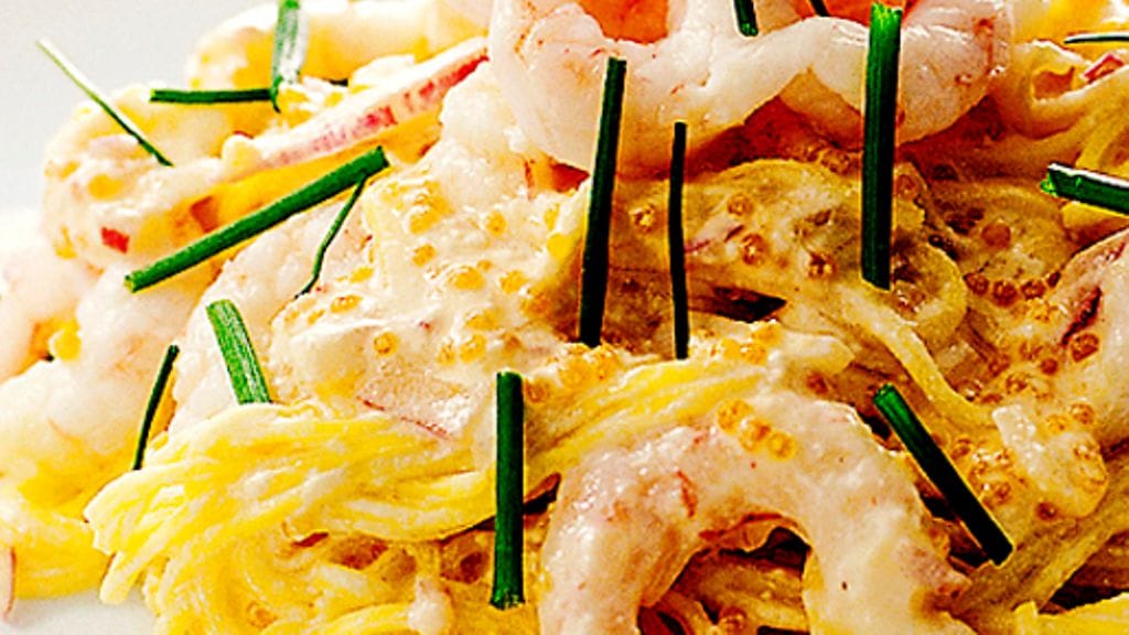 1. Kuori katkaravut. Kuori ja hienonna punasipuli. Keitä ranskankerma ja ruokakerma hiljalleen. Mausta suolalla ja pippurilla. Lisää punasipuli, mäti ja katkaravut.