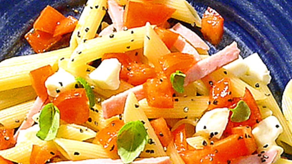 3. Sekoita tomaatit, kinkku, mozzarella ja basilika keskenään ja sitten pastan sekaan. Pinnalle vielä mustapippuria myllystä ja basilikanlehtiä.