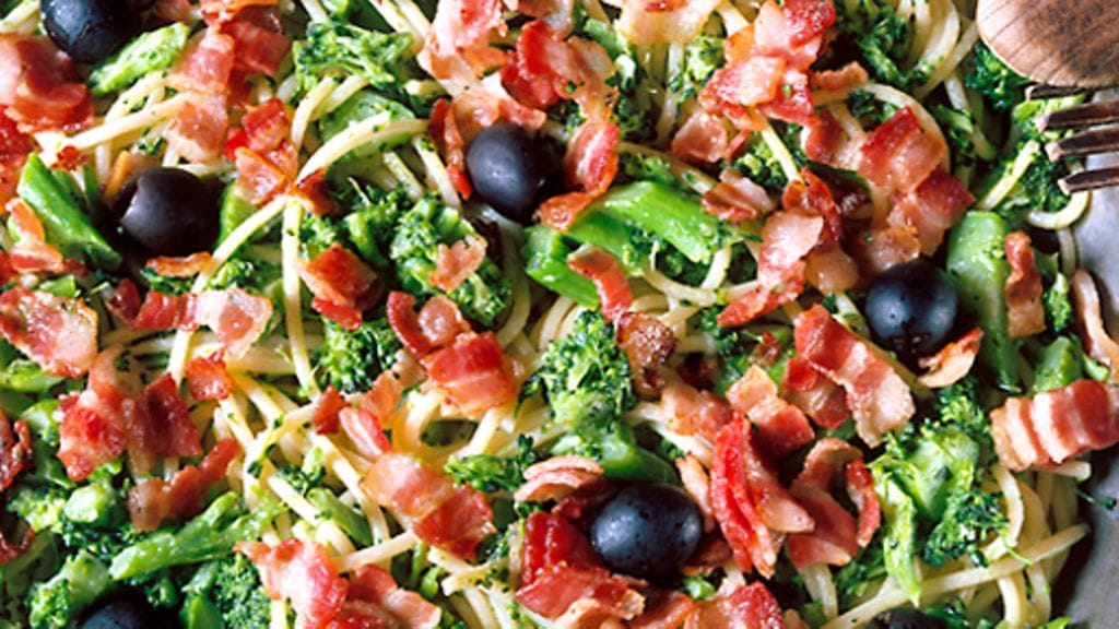 2. Ruskista pekoni pannulla rapeaksi, valulta talouspaperilla. Keitä pasta ja valuta. Kääntele spagetti parsakaalin joukkoon ja sekoita. Lisää oliivit ja murennetut pekonit. Tarjoile juustoraasteen kanssa.