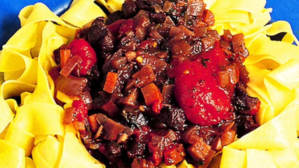 3. Anna kaiken porista kannen alla miedolla lämmöllä n. 3 tuntia. Lisää pikkuhiljaa tomaatit, laakerinlehti, oliivit ja liemi, vähän kerrallaan. Keitä pasta pakkauksen ohjeen mukaan, tarjoile valmiin kastikkeen kera.