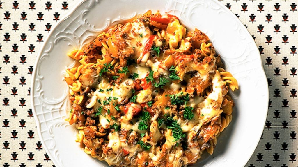2. Jauhelihakastike: Kuori ja hienonna sipulit. Kuutioi paprika. Viipaloi herkkusienet. Kuullota sipuleita öljyssä. Lisää jauheliha, paprikat ja herkkusienet. Paista kunnes jauheliha on kevyesti ruskistunutta ja murumaista. Ripottele päälle kasvisliemijauhe. Lisää chilikastike ja vesi ja anna kiehahtaa. Hauduta miedolla lämmöllä 8-10 minuuttia ja mausta pippurilla. Kaada jauhelihakastike pastan päälle vuokaan.
