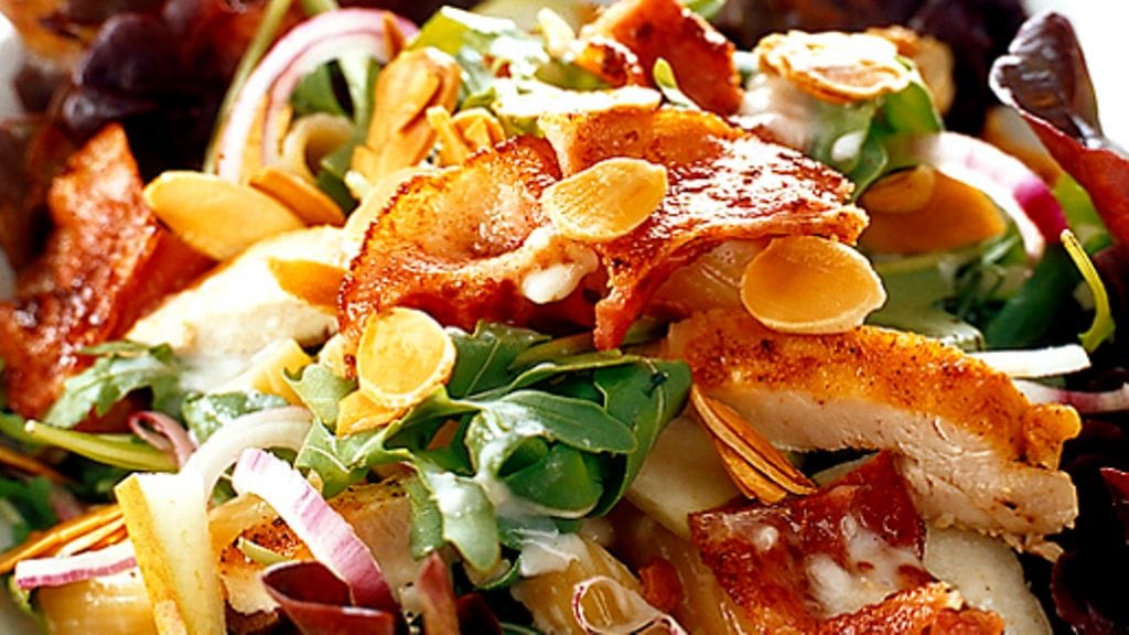 3. Annostele salaatti syvien lautasten pohjalle ja asettele päälle kermainen pasta, broilerinfileet, pekoni, punasipuli, mantelit ja päärynä.