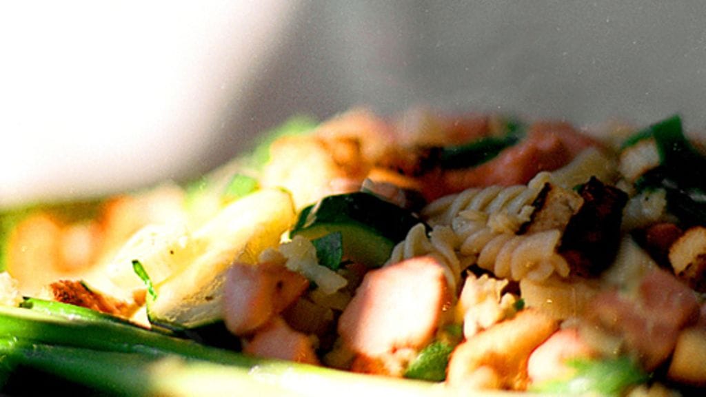 2. Keitä pasta pakkauksen ohjeen mukaan ja valuta lävikössä. Suikaloi kevätsipulit, kurkku ja kesäkurpitsa ja paloittele parsa. Hauduta parsaa ja sokeriherneitä kevyesti suolalla maustetussa vedessä minuutin ajan. Valuta. Sekoita parsa, sokeriherneet, pasta, kevätsipulit, kurkku ja kesäkurpitsa ja lisää joukkoon kastike.