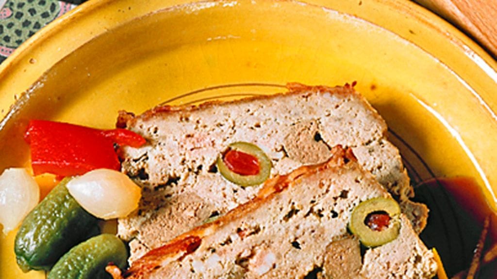 4. Kuumenna uuni 200 asteeseen. Voitele pitkänomainen leipävuoka. Kerrostele mureketta pekonin, maksojen ja oliivien kanssa, kunnes vuoka on täysi. Peitä vuoka pekoniviipaleilla.