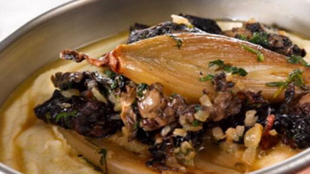 4. Sillä välin kun polenta hautuu miedolla lämmöllä karamellisoidut sipulit: Leikkaa sipulit puoliksi, ruskista öljyssä kuumalla pannulla.