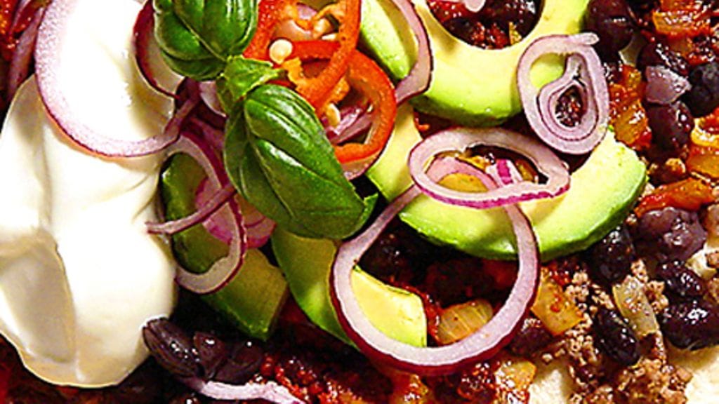 2. Paputäyte: Halkaise ensin chili, poista siemenet ja suikaloi palko. Hienonna valkosipulinkynnet, silppua sipuli. Kuullota sipulia, valkosipulia, chiliä ja juustokuminaa öljyssä. Murskaa papuja hieman ja sekoita joukkoon, sekoita mukaan tomaattipyree ja anna koko täytteen kuumentua täysin. Mausta sokerilla, suolalla ja basilikalla.
