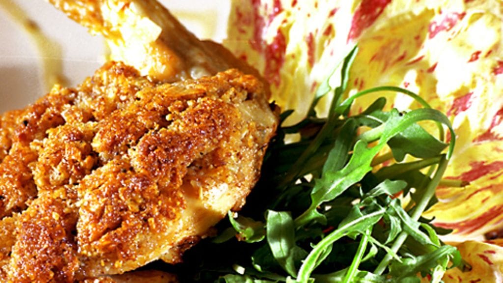 3. Levitä pähkinämassa rintaleikkeille ja pane uuniin 12-15 minuutiksi. Jaa rucolasalaatti neljälle lautaselle. Nosta paistetut rintaleikkeet rucolapedille ja koristele kokonaisilla pähkinöillä.