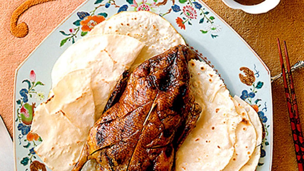 3. Kuumenna uuni 175 asteeseen. Nosta ankka uunipannun päälle ritilälle rinta ylöspäin. Työnnä uuniin ja kaada kuumaa vettä uunipannulle. 20 minuutin kuluttua ankannahan pitäisi olla kullanruskeaa. Käännä ankka varovasti ja paista toista puolta 25 minuuttia, käännä sitten jälleen ja jatka paistamista 20 minuuttia. Ankka on kypsää, kun reisi irtoaa helposti nivelestä. Alenna lämpöä loppupuolella jos nahan väri alkaa olla liian tumma. Siirrä kypsä ankka jäähtymään ritilälle 5 minuutiksi ennen kuin sitä ryhdytään leikkaamaan.