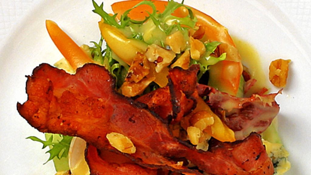3. Jaa salaatti neljälle lautaselle. Pane päälle kurkkuviipaleet ja paprikasuikaleet. Murenna päälle juusto. Viimeistele annos pekoniviipaleilla ja pähkinärouheella ja mausta hunajakastikkeella.
