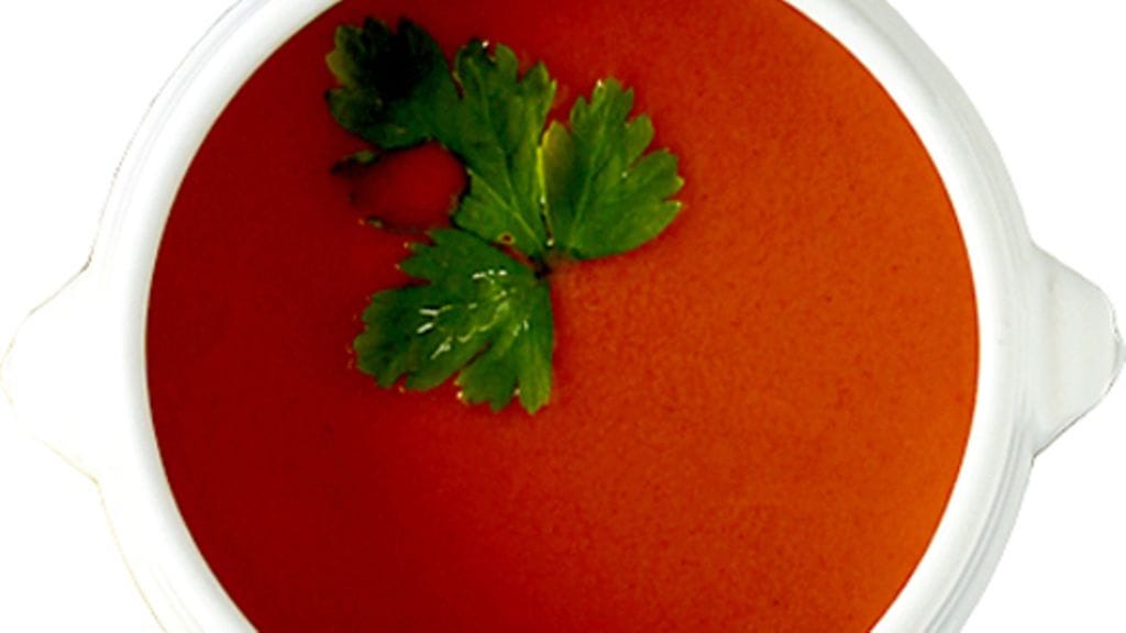4. Ota tomaatit purkista, paloittele ne ja laita kattilaan. Kaada mukaan tomaattiliemi purkista, mausta pippurilla, suolalla ja laakerinlehdillä. Laita kattila takaisin liedelle ja kuumenna kiehuvaksi kuumalla levyllä. Alenna lämpöä hieman ja keitä ilman kantta 2 minuuttia. Keitto alkaa nyt paksuuntua.