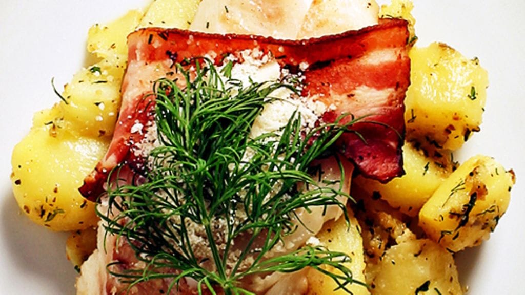 1. Kuumenna uuni 125 asteeseen. Kuutioi ja keitä perunat. Kuivaa turska ja mausta suolalla. Levitä turskafileen toiselle puolelle ohut kerros dijoninsinappia. Kääri pekoniviipaleet kalan ympärille.