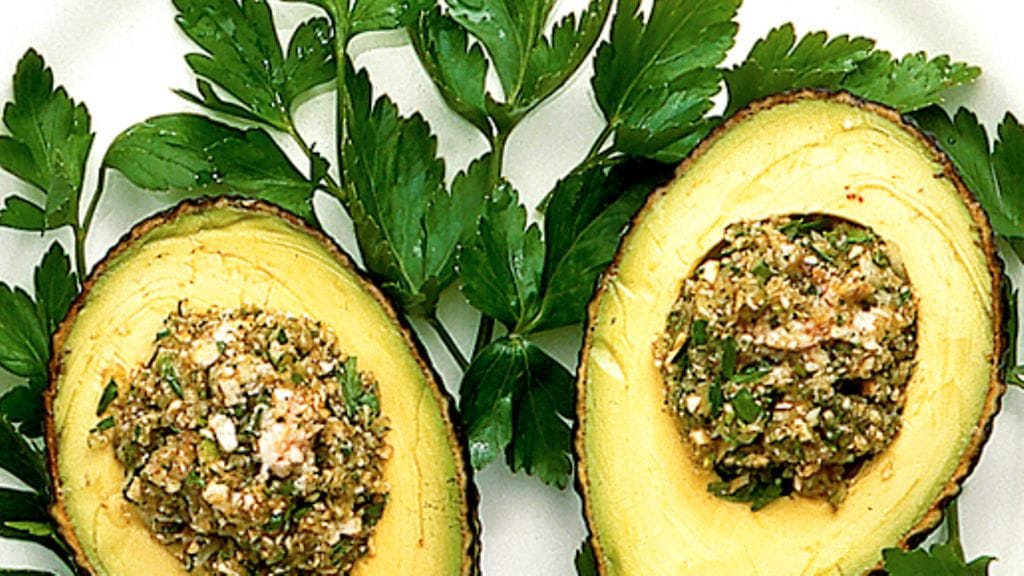 3. Leikkaa pekoni ohuiksi suikaleiksi ja paista ne paistinpannulla rapeiksi. Nosta pekonisuikaleet imeytymään talouspaperin päälle. Halkaise avokadot ja poista kivet. Lusikoi täyte avokadon puolikkaille ja ripottele pinnalle pekonisuikaleita.