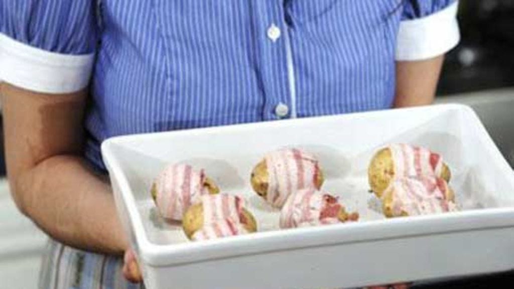 Paista perunoita 200 asteessa noin 40 minuuttia tai niin, että perunat ovat läpikypsiä ja pekoni rapeaa. Tarjoile perunat varrastikkuun lävistettynä.