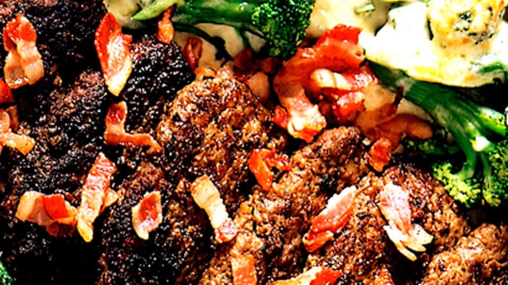 3. Laita valutetut parsakaalit uunivuokaan, kaada kastike päälle ja gratinoi uunissa noin 5 minuuttia. Aseta pihvit gratiinin päälle, ripottele paistetut pekonisuikaleet pihveille ja tarjoile.