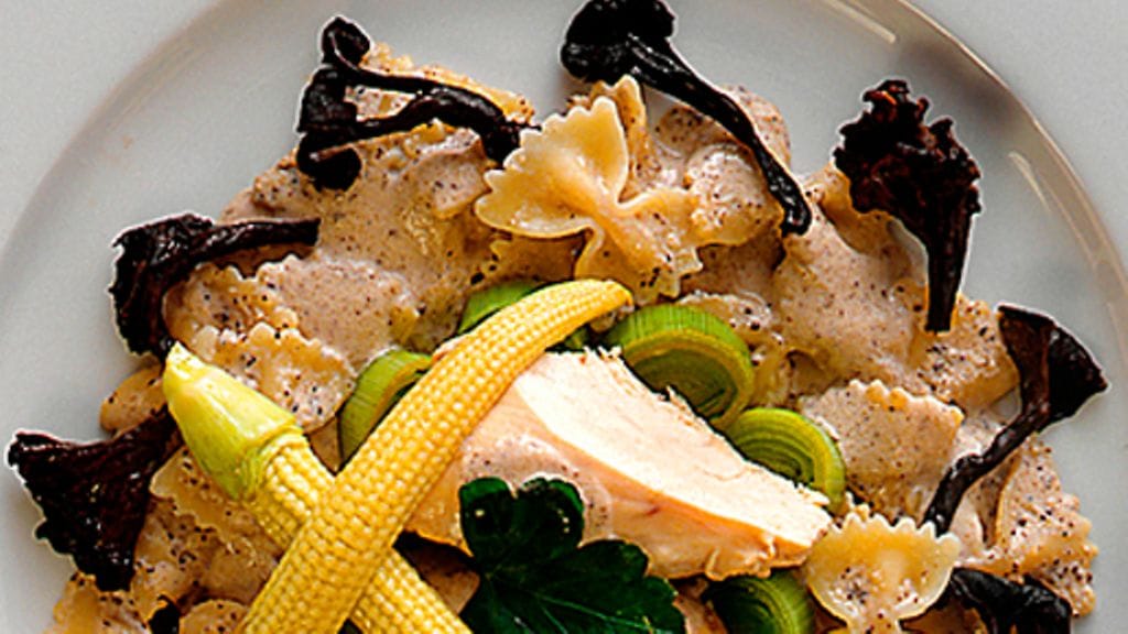 3. Paista torvisienet voissa, suolaa ja pippuroi. Jaa pasta neljälle lämpimälle syvälle lautaselle, lusikoi päälle kastiketta. Nosta annoksiin purjoa, fileet ja torvisieniä. Koristele halkaistuilla minimaisseilla.