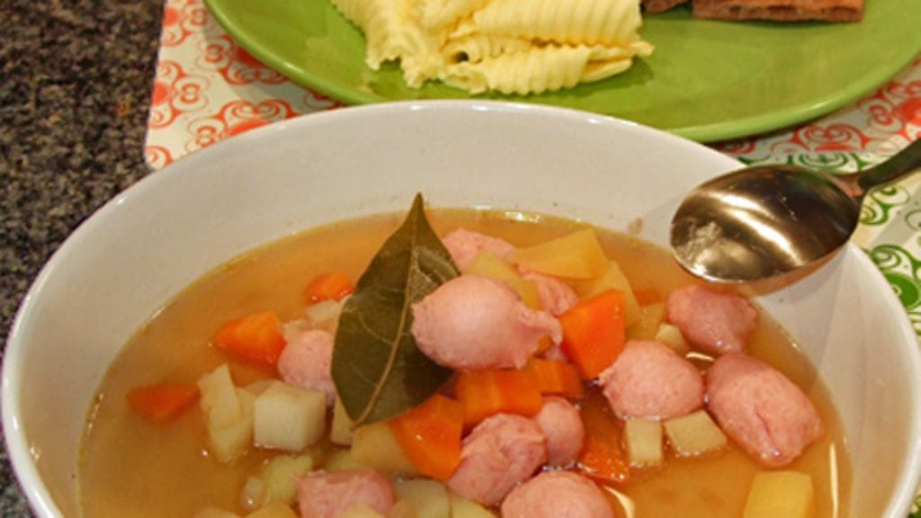 - Kun perunat ovat kypsiä, aloita siskonmakkaran pursottaminen kiehuvaan keittoon. Jos makkaramassaa tarttuu sormiin, kostuta niitä kylmällä vedellä. Kun makkarapallerot nousevat pintaan, ne ovat kypsiä.